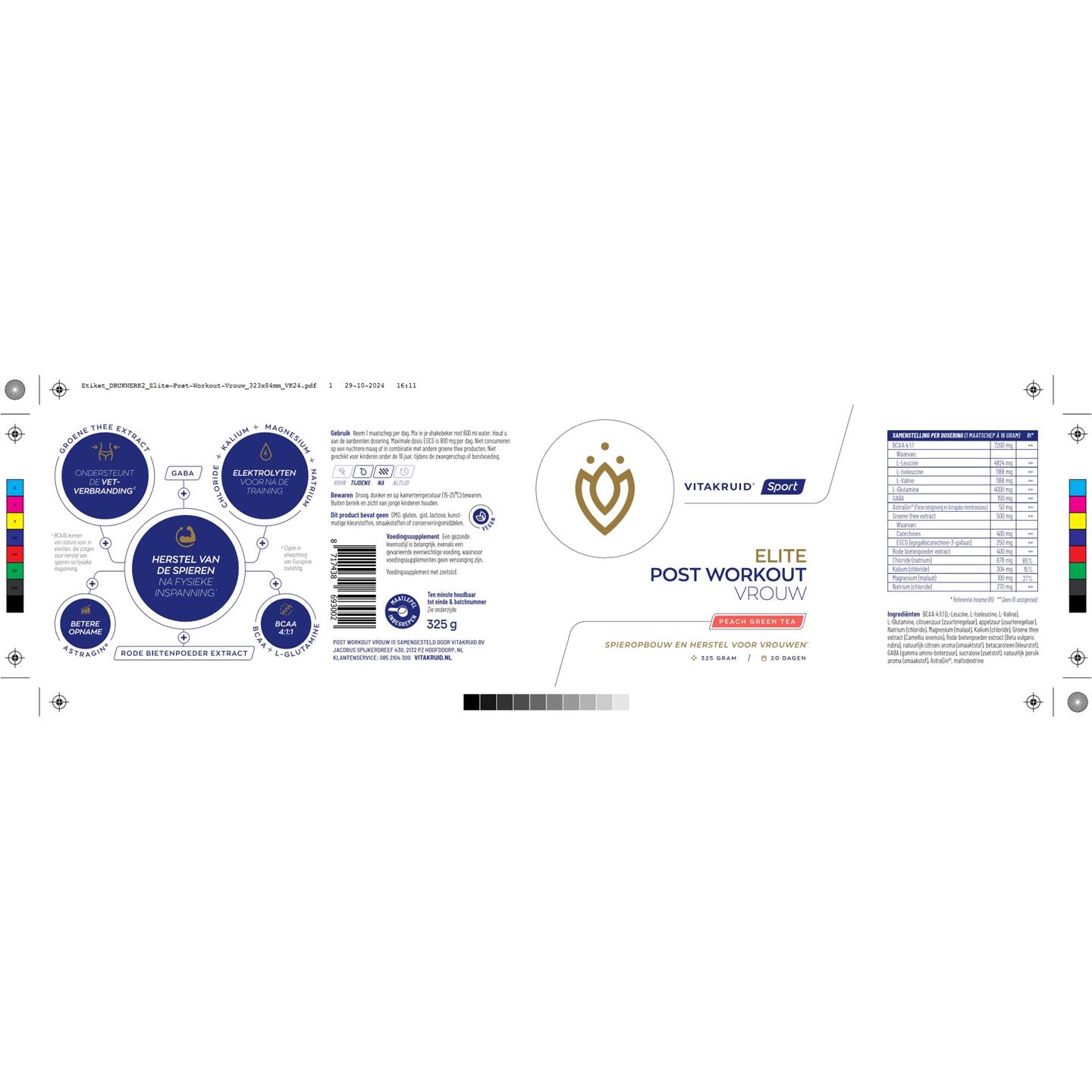 BCAA 4:1:1 (L-Leucine, L-Isoleucine, L-Valine), L-Glutamine, Citroenzuur (Zuurteregelaar), Appelzuur (Zuurteregelaar), Natrium (chloride), Magnesium (malaat), Kalium (chloride), Groene thee extract (Camellia sinensis), Rode bietenpoeder extract (Beta vulgaris rubra), Natuurlijk citroen aroma (Smaakstof), Betacaroteen (Kleurstof), GABA (gamma amino-boterzuur), Sucralose (Zoetstof), Natuurlijk perzik aroma (Smaakstof), AstraGin®, Maltodextrine.Waarschuwing