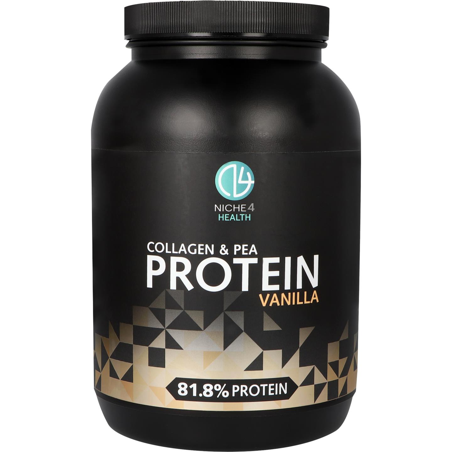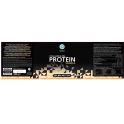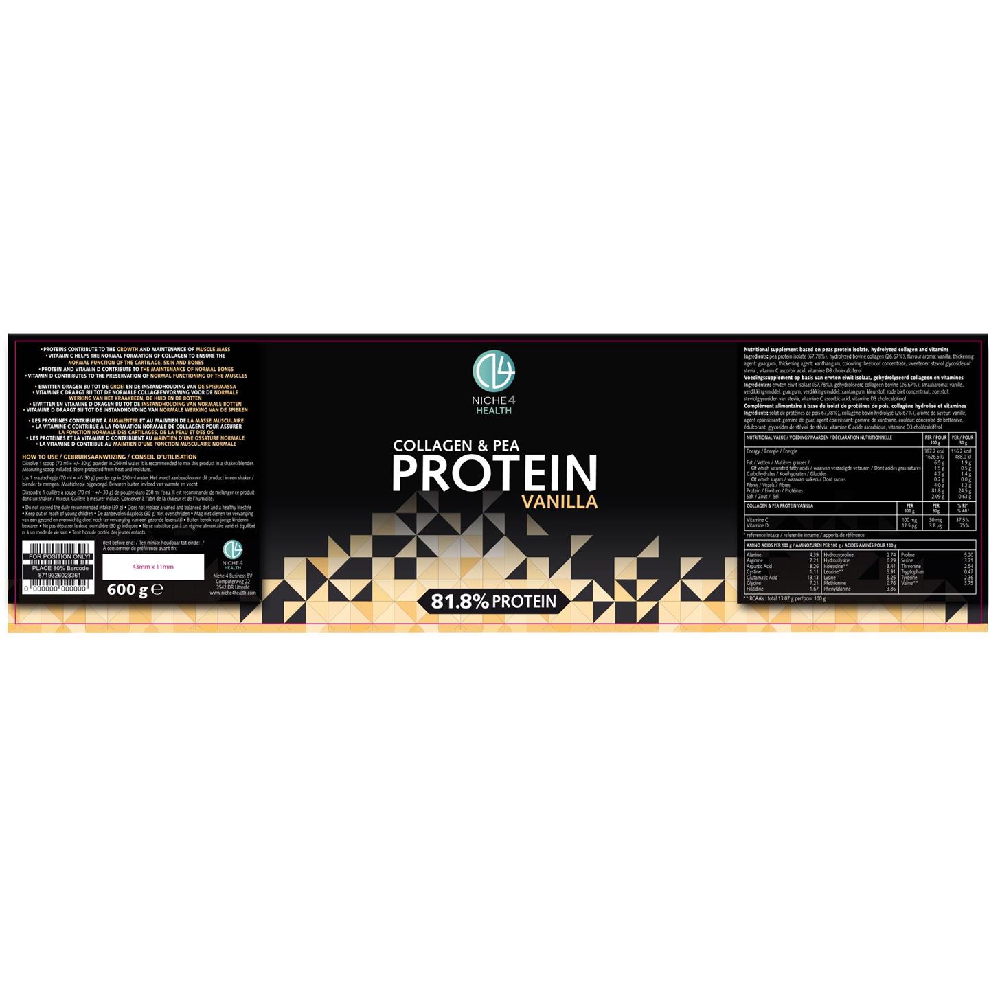 Erwten-eiwitisolaat, Gehydrolyseerd collageen bovine, Smaakaroma (Vanille), Verdikkingsmiddelen (Guargom, Xanthaangom), Kleurstof (Rode biet concentraat), Zoetstof (Steviolglycosiden van stevia), Vitamine C (ascorbinezuur), Vitamine D3 (cholecalciferol).